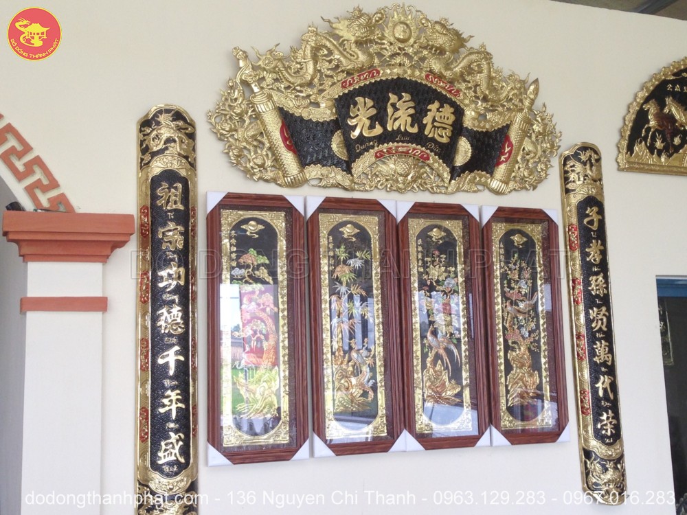 Cuốn thư được khảm chữ Hán Nôm " Đức Lưu Quang " bằng mặt đồng đỏ cao cấp. Đôi hoành phi câu đối " Tổ Tông Công Đức Thiên Niên Thịnh + Tử Hiếu Tôn Hiền Vạn Đại Vinh " Kèm theo các chữ Hán Nôm được khảm bằng đồng vàng là các chữ thư pháp quốc ngữ nhỏ ở phía bên dưới. Ở bốn góc của đôi câu đối là hình ảnh linh vật tứ linh: " Long Lân Quy Phụng " được khảm nổi bật lên trên bằng đồng vàng.