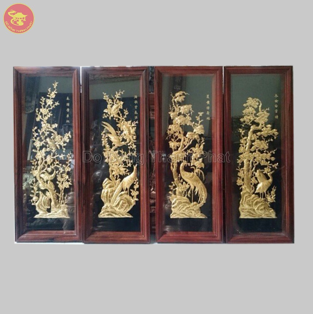 Hình ảnh Tranh đồng tứ quý " Tùng Cúc Trúc Mai " đồng vàng nền đen khung gỗ đẹp