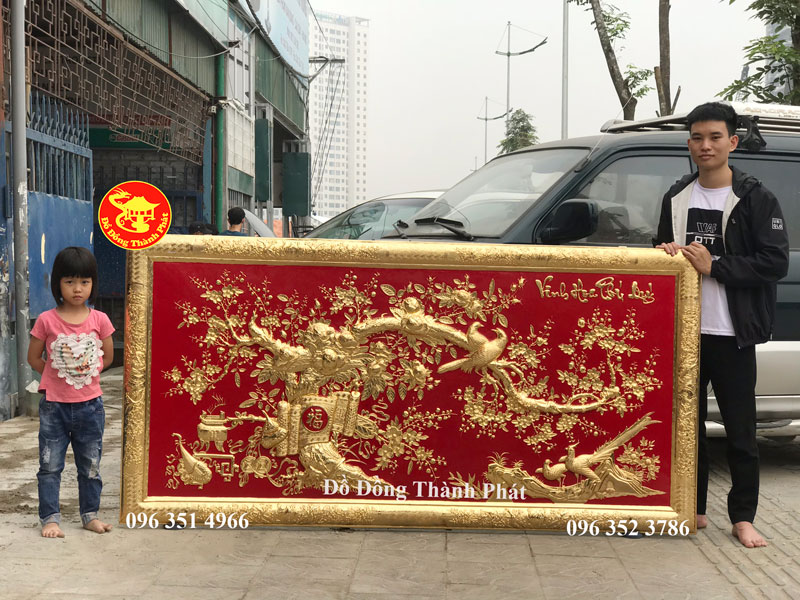 Bức tranh đông phủ vàng ròng cao cấp tranh vinh hoa phú quý mạ vàng 24 k dài 2,31 m rộng 1,27 m khung đồng tranh đồng phủ vàng ròng cao cấp chạm tay thủ công 100 %, mẫu tranh đồng phong thủy vinh hoa phú quý mạ vàng 24 k sơn nền đỏ được khách Hà Tĩnh đặt tranh đồng tại đơn vị tranh đồng Thành Phát chúng tôi, bức tranh đồng này được làm từ tấm đồng dát 8 dem, mạ vàng cao cấp,.., giá bán bức tranh này 59.000.000 đ Khuyến mại còn 55.000.000 đ.