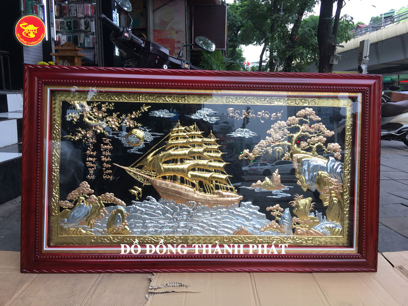 Bức tranh đồng thuận buồm xuôi gió tam khí dát vàng, dát bạc, đồng đỏ,.., bức tranh đồng phong thủy treo phòng khách, phòng làm việc cơ quan, doanh nghiệp đối tác, bức tranh đồng thuận buồm xuôi gió này dài 1,97 m rộng 1,07 m khung gỗ gụ đục dây xoắn thừng hạt cườm xoắn bi, kèm theo có gắn đèn led sáng,.., bức tranh đồng thuận buồm xuôi gió nà được gò chạm thủ công tinh xảo 100 %, đồng dầy 7 dem,.., giá bán bức tranh đồng thuận buồm xuôi gió 28.900.000 Km còn 22.900.000 đ.