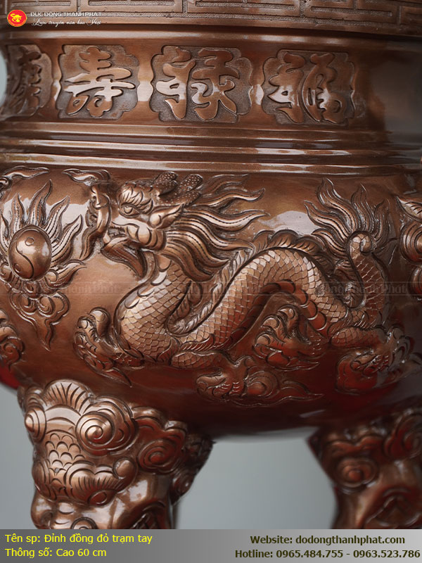 Bộ đỉnh đồng đỏ trạm thủ công của Thành Phát nổi bật với sự tinh tế trong từng chi tiết được chạm trổ công phu. Mỗi sản phẩm là một tác phẩm nghệ thuật độc bản, không chỉ có giá trị thẩm mỹ cao mà còn là biểu tượng của sự bền vững và trường tồn. Sở hữu một bộ đỉnh đồng trạm thủ công là đầu tư xứng đáng, giá trị của sản phẩm tăng theo thời gian nhờ quy trình chế tác thủ công tỉ mỉ và công phu.