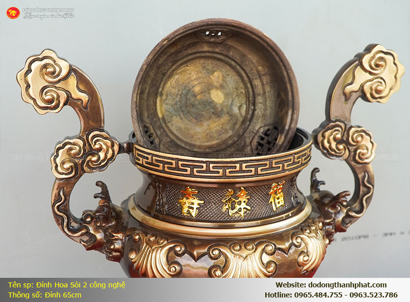 Sự chắc chắn và uy nghi của chiếc đỉnh hoa sòi cao 65cm còn được thể hiện qua hệ thống chân trụ và tai mây được đúc liền khối hoàn toàn. Các bác lưu ý, đối với hàng kỹ Thành Phát, ba chân trụ đầu hổ phù không bao giờ có sự hàn nối hay chắp vá. Chúng được đúc liền mạch từ thân đỉnh đi xuống, tạo nên một cấu trúc kiên cố như bàn thạch, giúp đỉnh đứng vững chãi trên mọi bề mặt ban thờ. Hình tượng hổ phù ở chân trụ được chạm trổ uy linh, không chỉ đóng vai trò chịu lực cho toàn bộ khối đồng nặng hàng chục kilogam mà còn mang ý nghĩa trấn trạch, xua đuổi tà khí. Độ đồng nhất của phôi đồng từ trên xuống dưới giúp âm thanh khi các bác gõ nhẹ vào đỉnh sẽ phát ra tiếng ngân vang đanh thép, trong trẻo – một đặc điểm chỉ có ở chất liệu đồng vàng tinh khiết, không pha tạp chất hay chì. Việc sở hữu một phôi đồng dày và chuẩn không chỉ mang lại giá trị thẩm mỹ trước mắt mà còn là lời cam kết về một báu vật truyền đời, không lo xuống cấp hay biến dạng qua hàng trăm năm.
