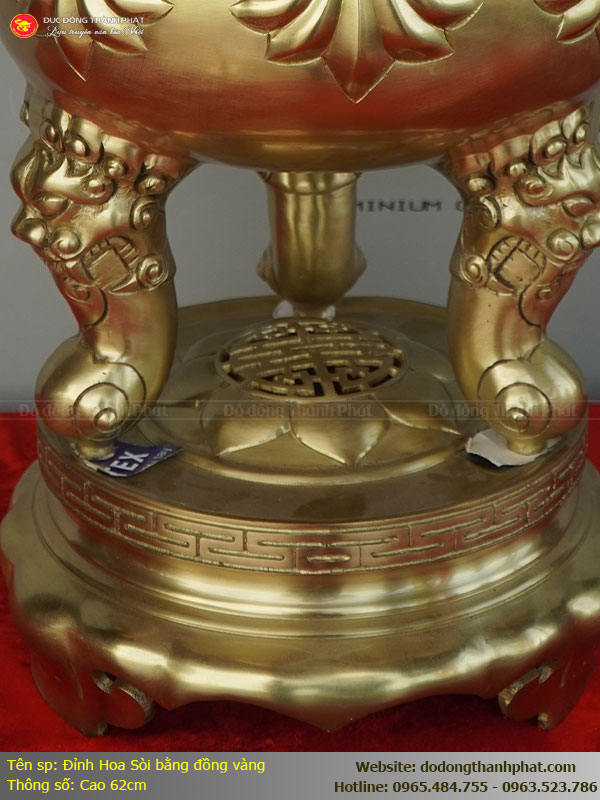 Với tầm thước 62cm – con số đại diện cho sự vững chãi và vươn mình, chiếc đỉnh mang dáng vẻ bầu tròn đầy đặn, tượng trưng cho sự viên mãn, sung túc của một gia đình hạnh phúc. Từng đường nét được đúc từ đồng vàng nguyên khối, tỏa ra ánh kim ấm áp như nắng sớm, vừa kiêu hãnh khẳng định vị thế gia tộc, vừa giữ được nét khiêm nhường, thành kính nơi cửa tâm linh. Sắc vàng ấy không chỉ làm sáng bừng gian thờ mà còn là biểu tượng của sự hanh thông, là lời nguyện cầu cho phú quý luôn hội tụ và nảy nở.