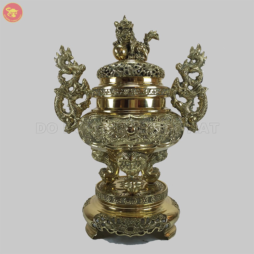 - Tên sản phẩm: Đỉnh đồng lưỡng long trầu nguyệt đồng vàng cao 30 cm