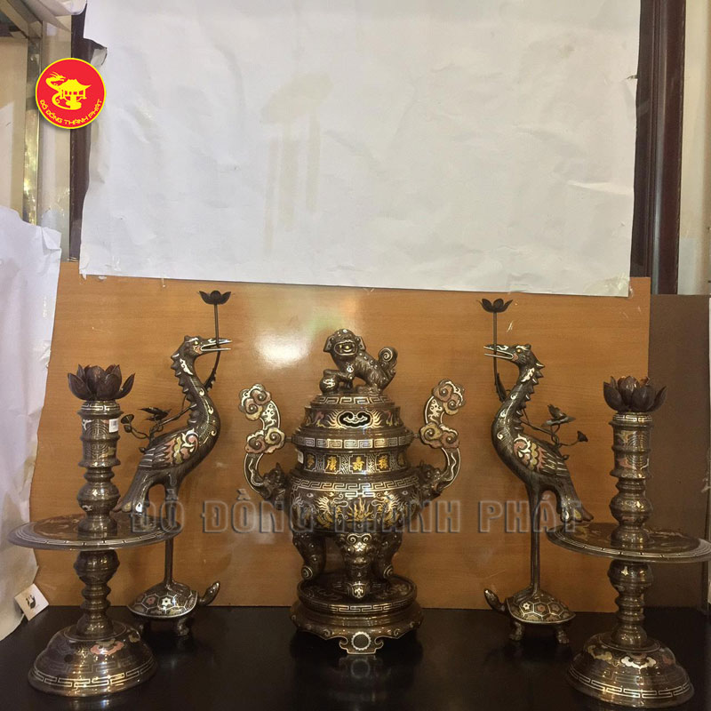 - Bộ ngũ sự khảm ngũ sắc 65 cao tới nghê đồng 62 cm phù hợp với ban thờ gia tiên dài 1,97 m, tới 2,15 m. rộng 97 tới 1,07 m