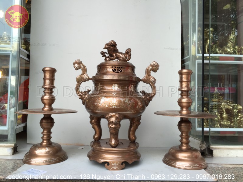 Hình ảnh: Bộ lưu hương thờ cúng bàng đồng đỏ đẹp tay mây mẫu song long trầu nguyệt cao 1,08m