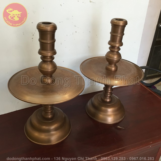 Đôi chân nến bằng đồng Chân nến thờ bằng đồng được đúc thành 3 phần: phần chân đế loe vững trãi, ở giữa là bát nến, lắp ở trên miệng rộng dùng để cốc nến hoặc cắm nến cây. Kích thước của đôi chấn nến phụ thuộc vào chiều cao của đỉnh đồng và kích thước của ban thờ. Đôi chân nến thường được đặt hai bên của đỉnh trên ban thờ, vừa mang ý nghĩa tâm linh, vừa mang ý nghĩa thẩm mỹ cao
