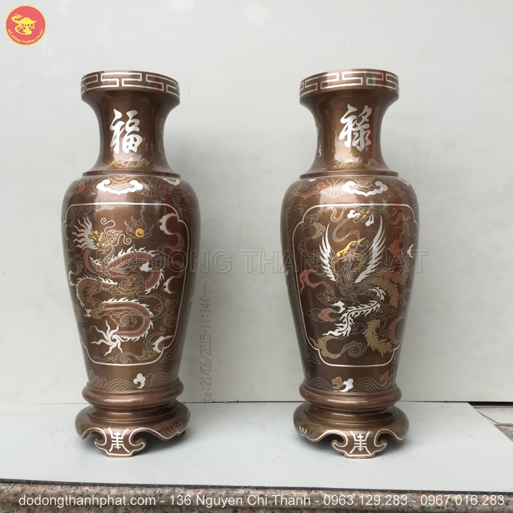 Lọ hoa bằng đồng khảm ngũ sắc long phụng cao 55 cm được đúc thủ công bằng đồng đỏ nguyên chất cùng các đường nét hoa văn hoàn mỹ với hai khung tranh long trầu nguyệt, phụng vờn mây cực kỳ sống động bởi các nét khảm tinh xảo, mịn màng.