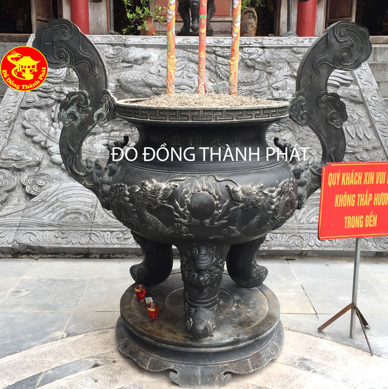 Đỉnh đồng là một trong những bộ đồ thờ bằng đồng cho nên được các nghệ nhân đúc thủ công bằng đồng thau nguyên khối rồi đem đi nung nóng hun thành lâu đen rất công phu. Phía trước mặt tiền của đỉnh là hình ảnh song long trầu phụng cùng với đó là 3 chữ Hán Nôm " Phúc Lộc Thọ " được khảm nổi bật lên các hoạ tiết.