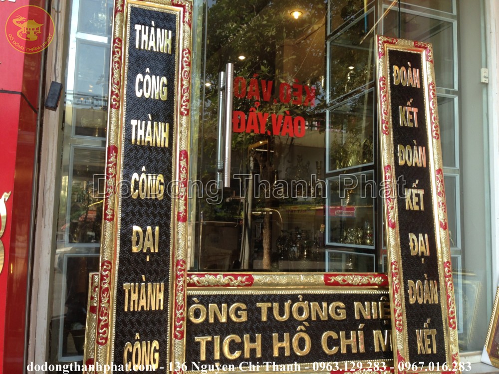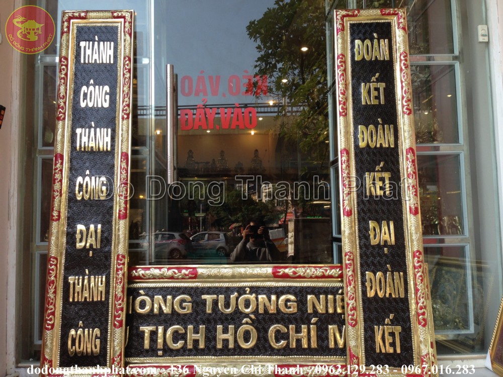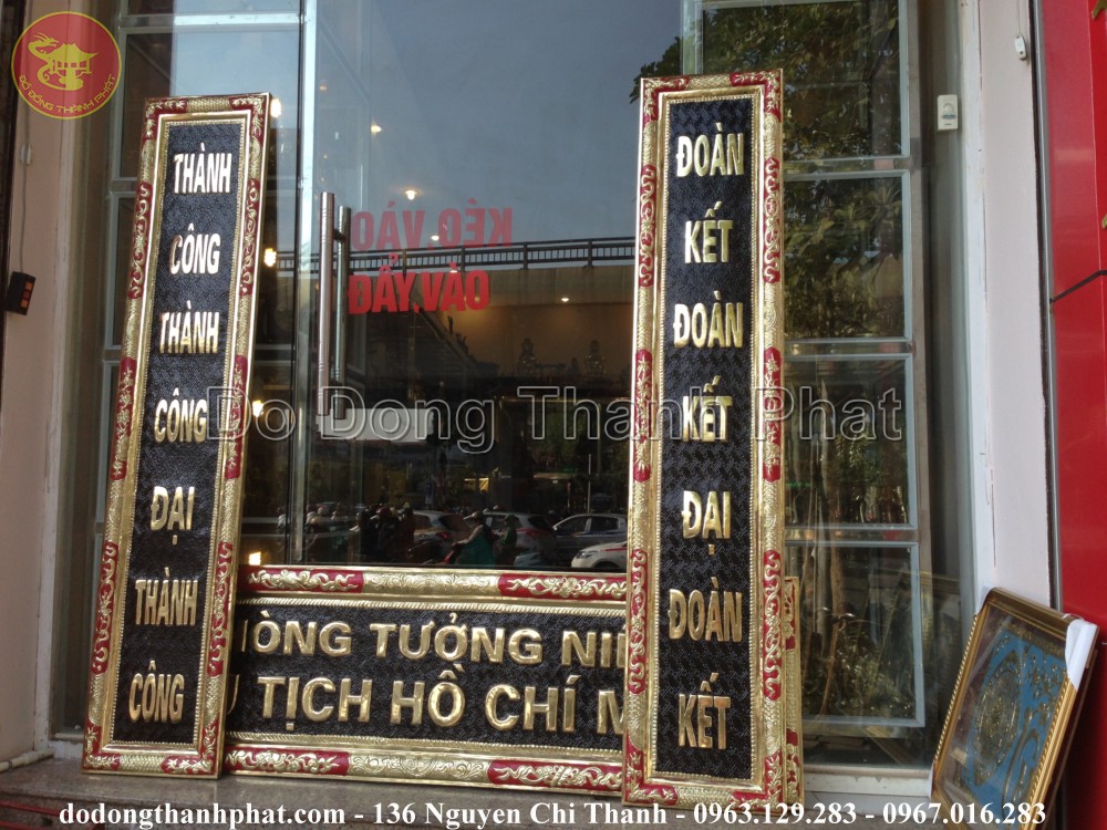 Tên đầy đủ: Bộ hoành phi câu đối đồng vàng khung gỗ cao 68 cm, dài 1,76 m