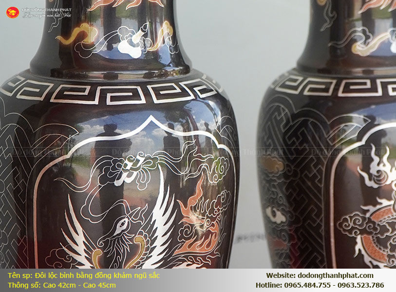 Trên một ban thờ gia tiên đủ đầy, nếu đỉnh đồng là nơi hội tụ linh khí, đôi hạc là biểu tượng thanh cao, thì đôi lọ hoa chính là vật phẩm mang lại sự tươi mới và sinh khí. Tại Đồ Đồng Thành Phát, đôi lọ hoa khảm ngũ sắc dáng lộc bình với chiều cao chuẩn phong thủy từ 42cm đến 45cm hiện lên như một cặp bảo vật "tụ khí, sinh tài". Được chế tác từ đồng đỏ nồi hè quý hiếm, báu vật này không chỉ gánh vác trọng trách dâng những đóa hoa tươi thắm lên tổ tiên mà còn là một tác phẩm nghệ thuật đỉnh cao, nơi sự hòa hợp âm dương được thể hiện qua hình ảnh Rồng uy nghiêm và Phượng thanh cao xum vầy.
