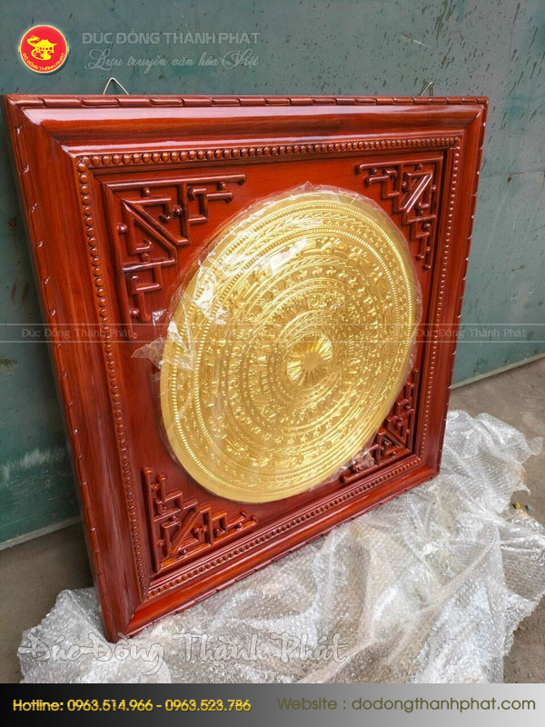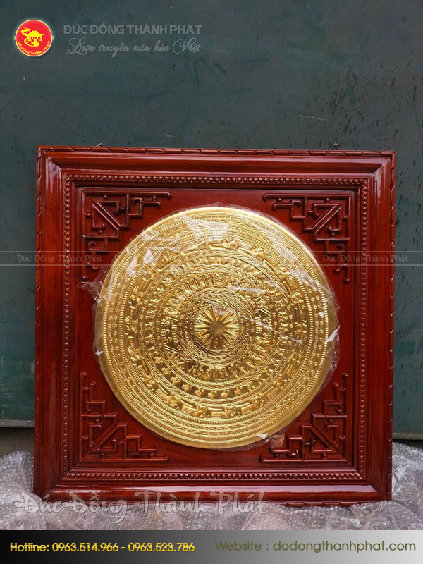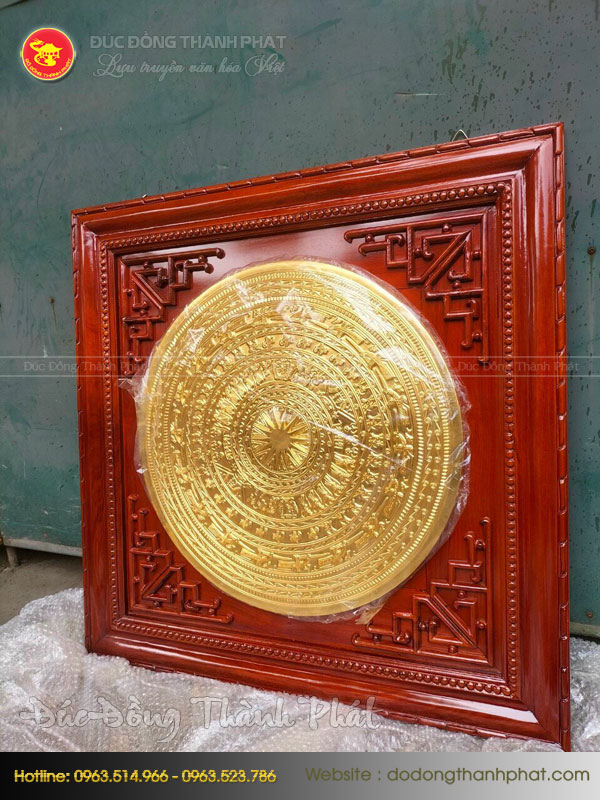 Mặt trống đồng treo tường mạ vàng khung gỗ gụ