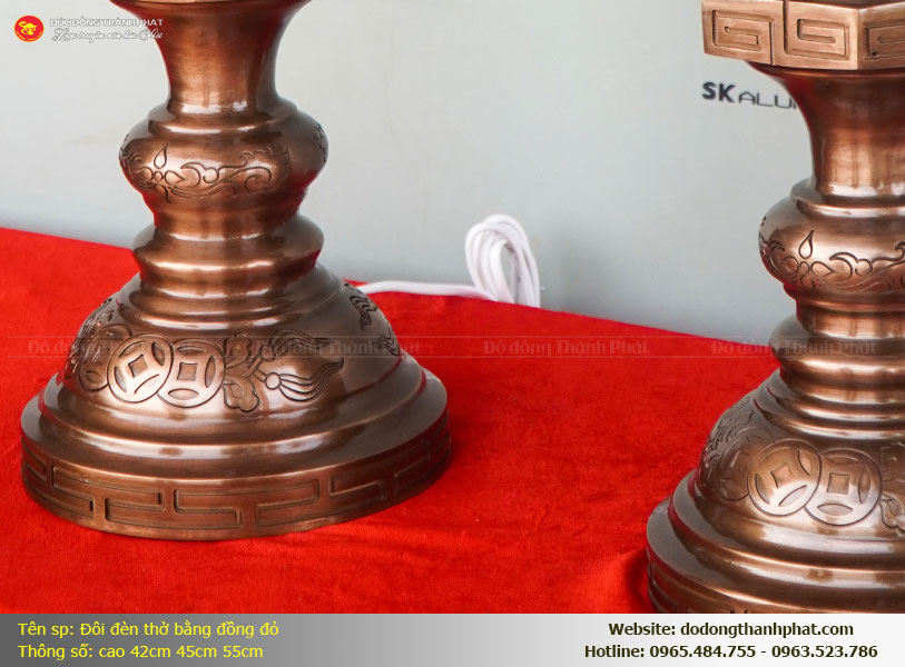 Mỗi đôi đèn tại Thành Phát sau khi đúc xong còn được xử lý bề mặt thủ công bằng các loại đá mài để giữ nguyên màu đỏ thâm trầm, mộc mạc nhất. em không dùng các loại sơn mạ công nghiệp che lấp đi vẻ đẹp của đồng, bởi chính sự mộc mạc ấy mới là đẳng cấp của hàng cao cấp. Một vật phẩm được chăm chút tỉ mỉ từ những chi tiết nhỏ nhất như đôi đèn thờ sẽ là mảnh ghép hoàn hảo, tôn vinh lòng hiếu kính của các bác dành cho tổ tiên.
