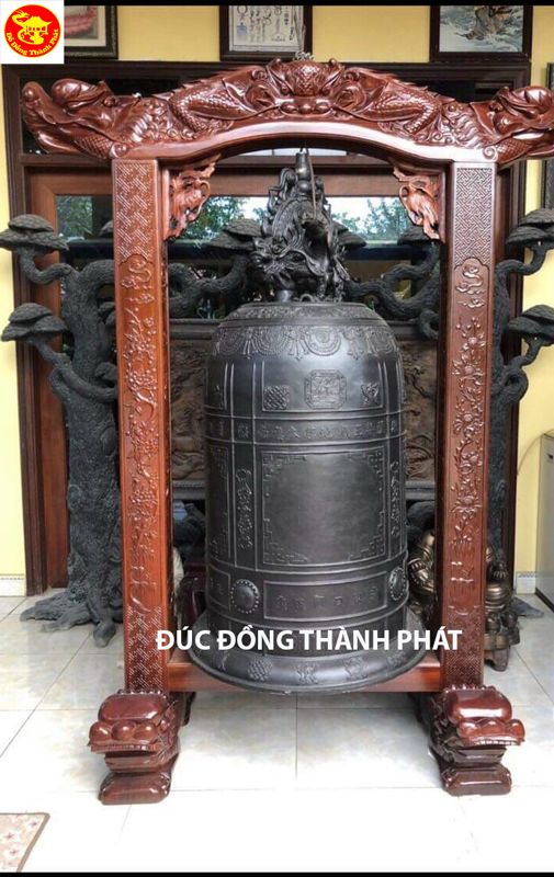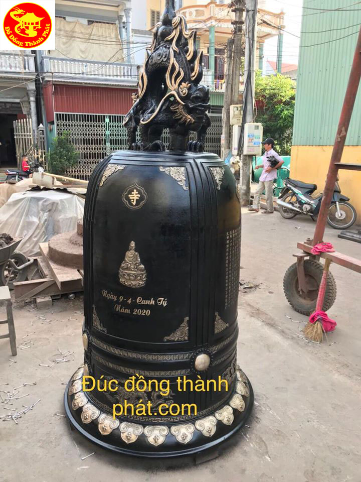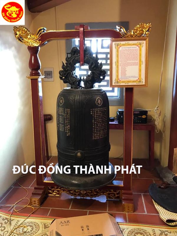 Đúc chuông đồng hoàn thiện tiếng hay khối lượng chuông đồng đúc nặng 300 kg chuông đồng được treo trên giá chuông đúc tứ quý, đầu rồng đúc nổi chạm đẹp, chuông đồng đúc hoàn thiện cao 1,37 m đường kính miệng chuông đồng 61 cm, chuông đồng đúc hoàn thiện được làm màu hun giả cổ như hình treo trên chuông.