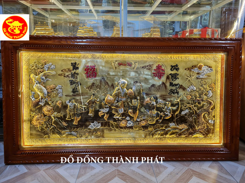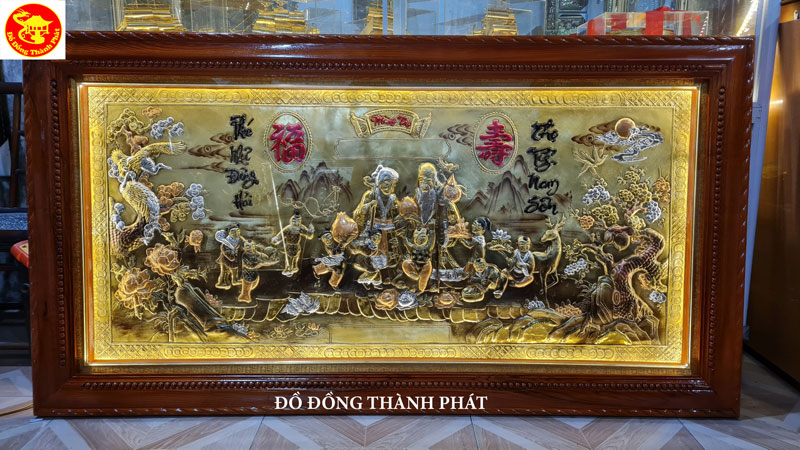 Bức tranh đồng mừng thọ cụ ông khổ lớn dài 1,7 m rộng 88 cm, tranh đồng ngũ sắc năm màu khung gỗ trò có gắn đèn led sáng, bưc tranh đồng chúc thọ cụ ông dùng trong hoàn cảnh cụ ông được thọ, cụ bà không còn nội dung viết chúc thọ cụ ông theo bối cảnh ông mừng xuân Quý Mão 2023 giá 7.900.000 đ Km còn 5.900.000 đ
