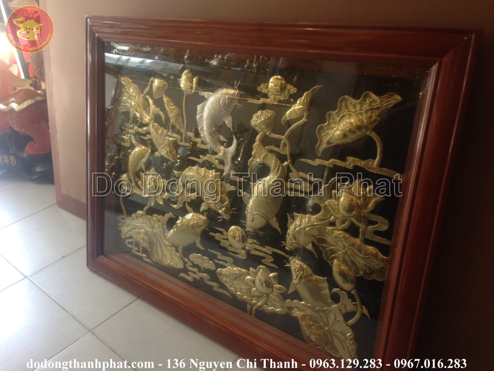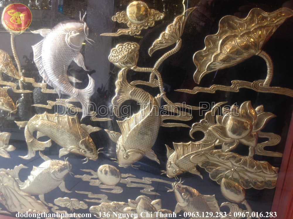 Tranh đồng mỹ nghệ Cửu Ngư Quần Hội được chạm khắc thủ công bằng tay từ tấm đồng vàng dày 7ly vô cùng tỉ mỉ, tinh xảo ở từng đường nét của bức tranh đồng.