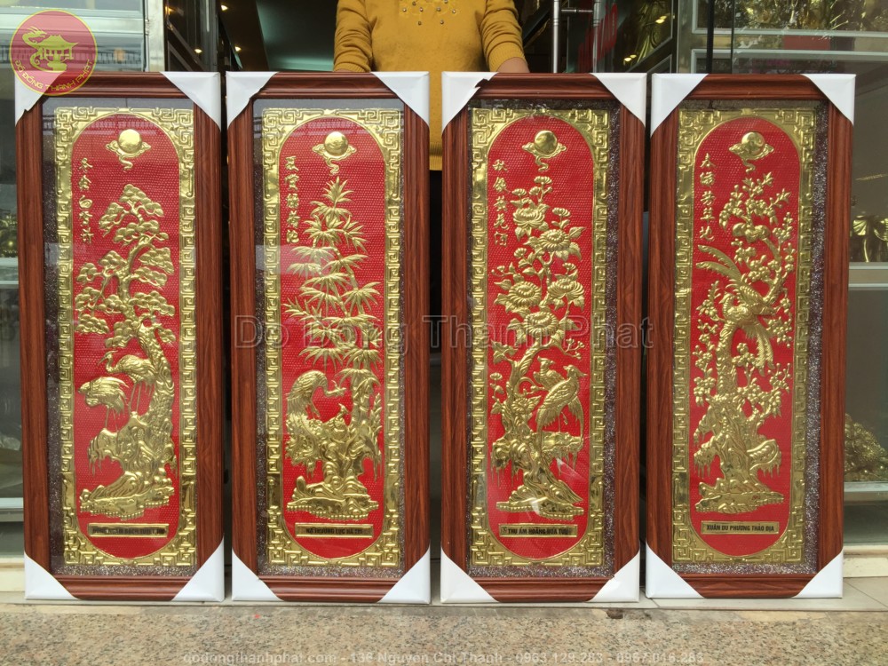 Tranh đồng tứ quý " Tùng Cúc Trúc Mai " đồng vàng nền đỏ khung gỗ