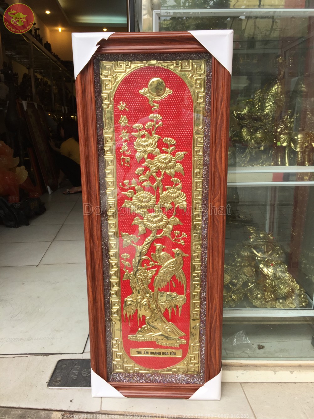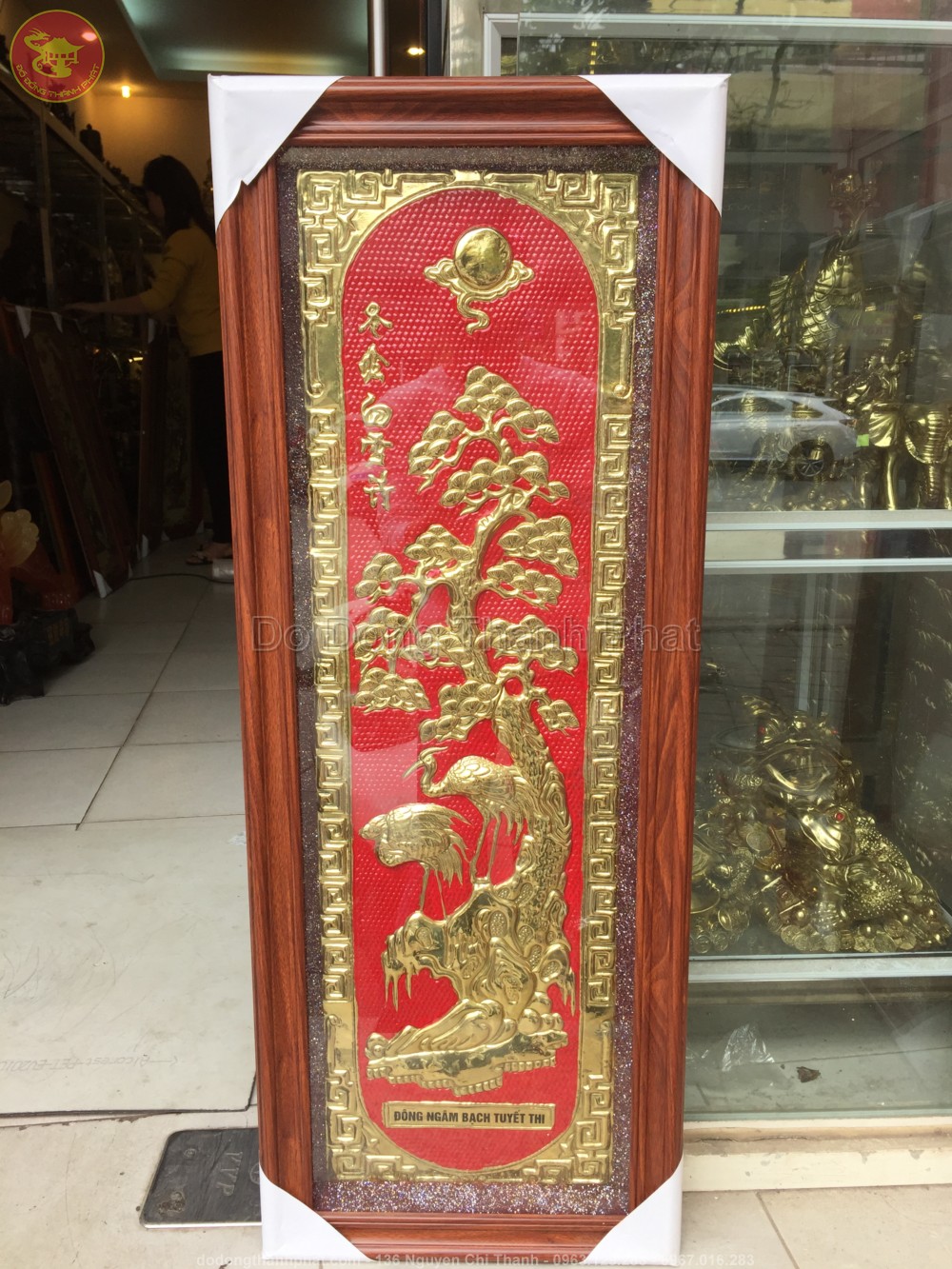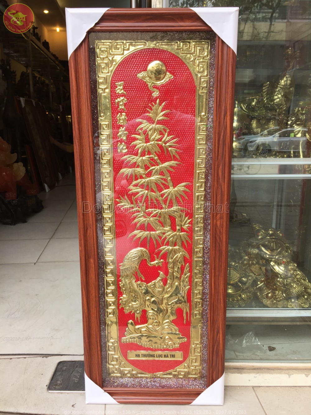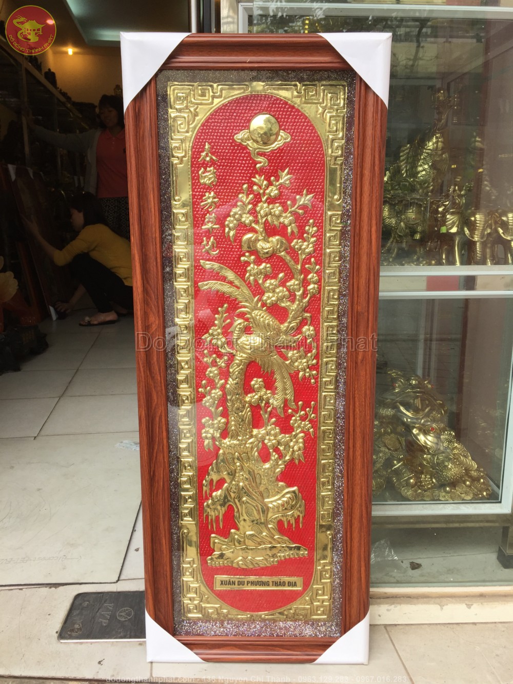 Chất liệu: Đồng vàng nguyên chất trên nền đồng đỏ, khung được làm bằng gỗ.