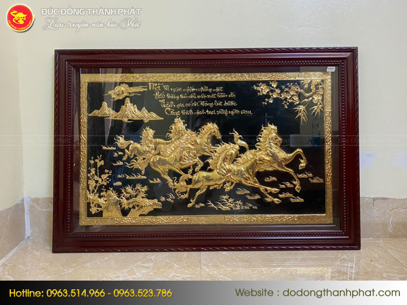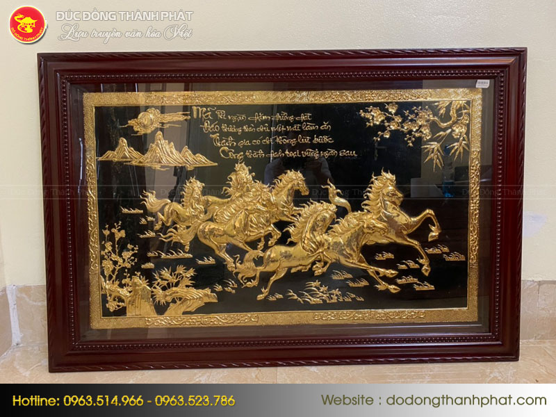 Bức tranh đồng mạ vàng mã đáo thành công dài 1,33 m rộng 88 cm sơn nền đen khung gụ được đồ đồng Thành Phát bán ra với giá 25.900.000 đ