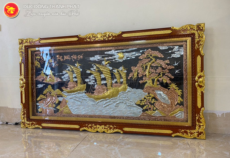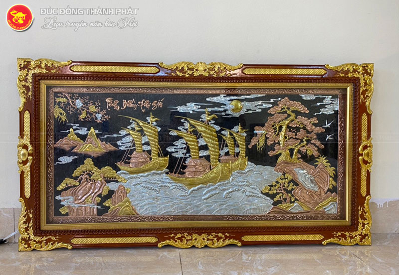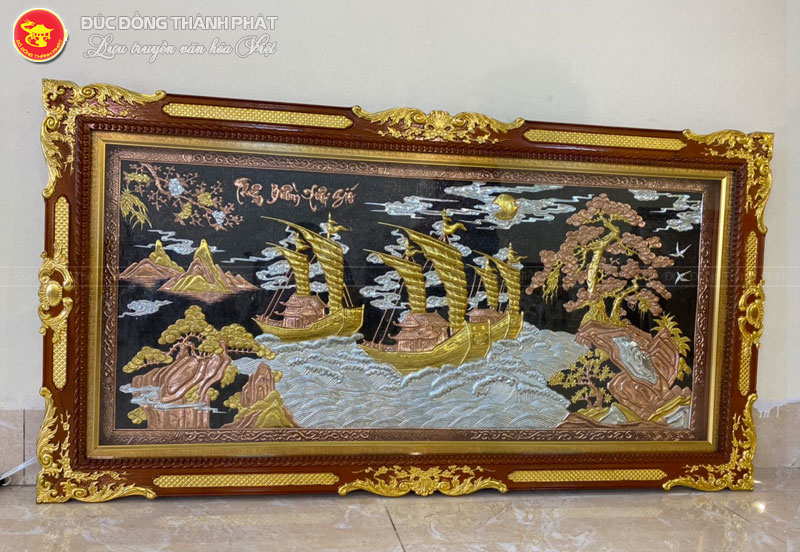 "Chúc thuận buồm xuôi gió" - Một câu chúc rất quen thuộc mỗi khi ai đó chuẩn bị làm một việc gì đó lớn lao, có lẽ đó là một nét đẹp trong văn hóa Việt Nam chúng ta. Câu chúc không chỉ dừng lại ở phạm trù giao tiếp xã giao, nó đã được các nghệ nhân đồ đồng Thành Phát nâng lên trở thành một tác phẩm nghệ thuật mang nhiều ý nghĩa phong thủy. Hôm nay đồ đồng Thành Phát xin giới thiệu bộ tranh Thuận Buồm Xuôi gió ngũ sắc khổ lớn dài 2m3, khung gỗ tự nhiên, sử dụng 3 kim loại vàng, bạc, đồng
