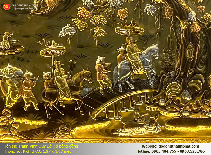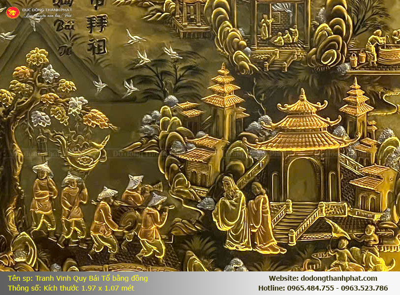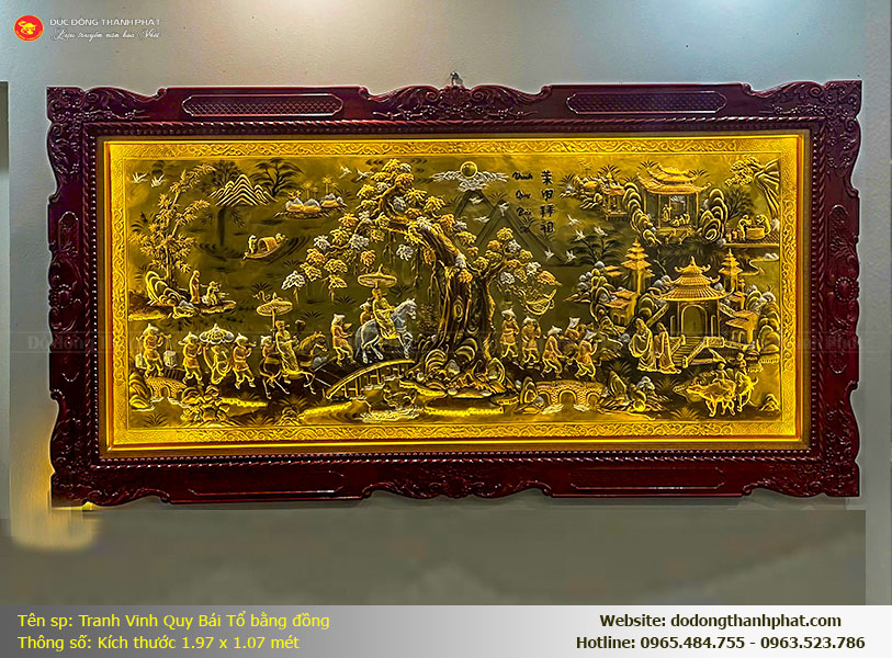 Tranh đồng Vinh Quy Bái Tổ là một tác phẩm nghệ thuật độc đáo, mang đậm giá trị văn hóa và truyền thống của dân tộc Việt Nam. Bức tranh là một vật phẩm trang trí sang trọng và chứa đựng ý nghĩa sâu sắc về lòng hiếu thảo, truyền thống hiếu học và tinh thần "uống nước nhớ nguồn" của người Việt. Tại Đồ Đồng Thành Phát, chúng tôi tự hào giới thiệu đến quý khách hàng bức tranh đồng Vinh Quy Bái Tổ được chế tác tinh xảo, mang đến vẻ đẹp hoàn mỹ cho không gian sống của bạn.