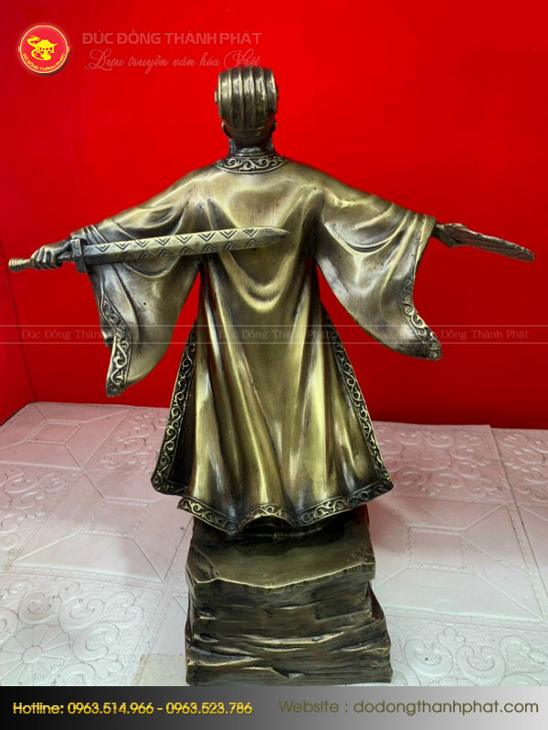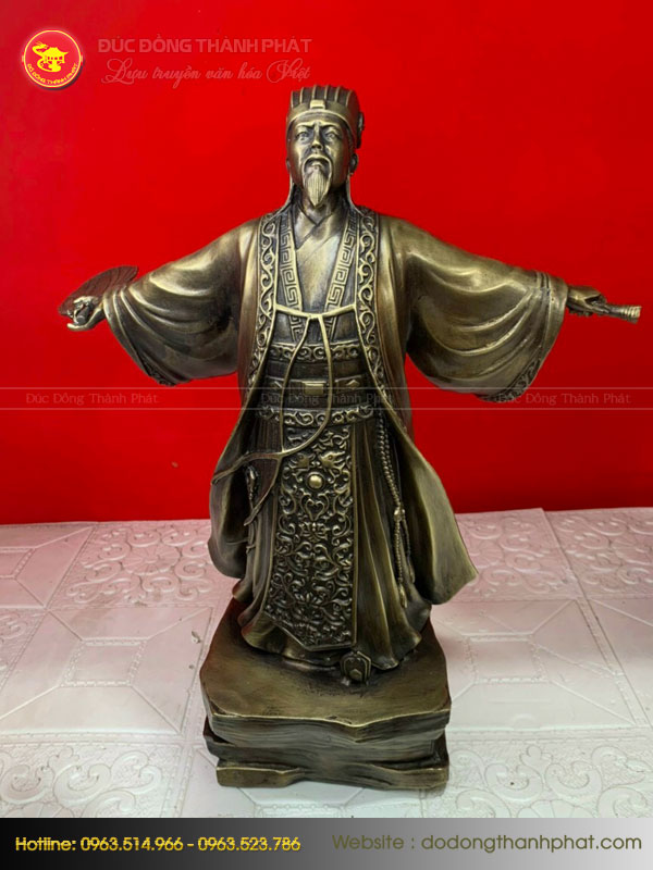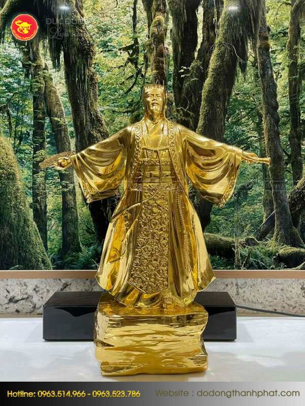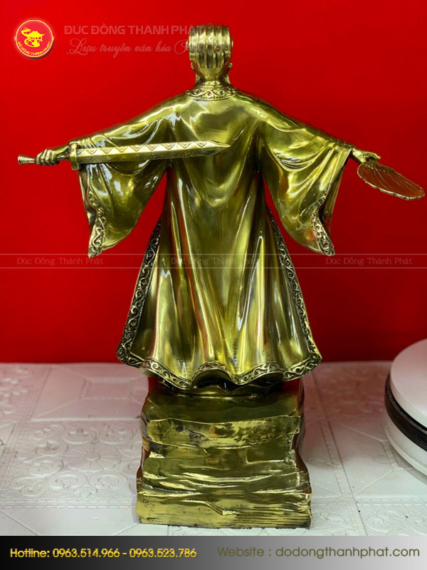 Tượng Khổng Minh đứng dang 2 tay ngửa mặt lên trời như muốn ôm lấy càn khôn, thâu tóm toàn thiên hạ. Tượng cao 50 cm được đồ đồng Thành Phát đúc bằng đồng vàng cao cấp, sơn phủ bóng. Nếu quý khách hàng có nhu cầu chúng tôi sẽ mạ vàng 24 k tượng bằng phương pháp điện phân cao cấp