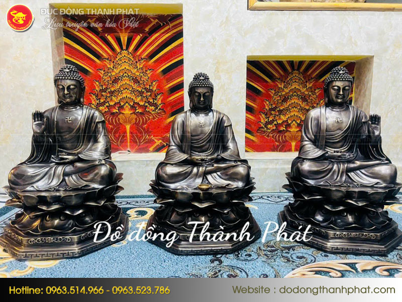 Tượng tam thế phật bằng đồng hun giả cổ được chế tác theo đơn đặt hàng tại Hà Nội đón ngày lễ Phật Đản 2023. Bộ Tượng Tam Thế Phật ngồi tòa sen cao 51 cm, thích hợp các phòng thờ Phật tại gia. Sản phẩm đang được trưng bày tại các showroom của Đồ Đồng Thành Phát