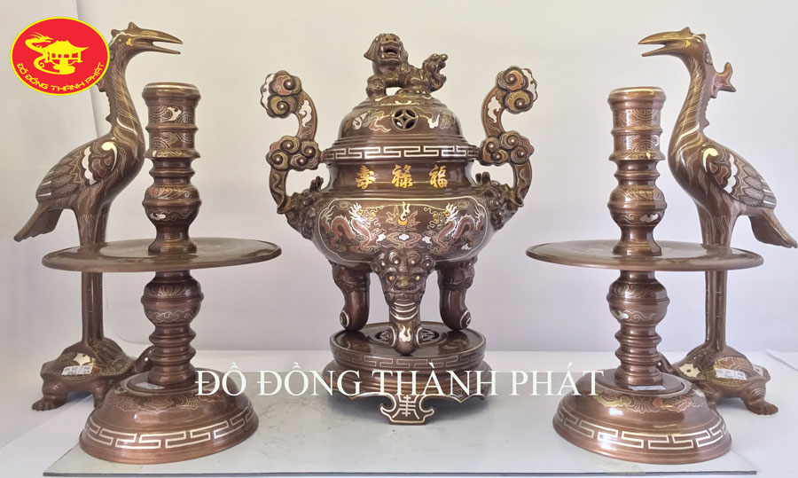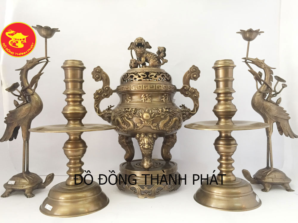 Đôi chân nến đồng: Chân nến thờ bằng đồng đúc tinh xảo hình tứ linh, mặt hổ phù, họa tiết nổi chân từng chi tiết tạo nên sự hài hòa, cân đối của cây nến với các sản phẩm đồ đồng khác. Chân nến thờ bằng đồng được đúc thành 3 phần: phần chân đế loe vững trãi, ở giữa là bát nến, lắp ở trên miệng rộng dùng để cốc nến hoặc cắm nến cây. Kích thước của đôi chấn nến phụ thuộc vào chiều cao của đỉnh đồng và kích thước của ban thờ. Đôi chân nến thường được đặt hai bên của đỉnh trên ban thờ, vừa mang ý nghĩa tâm linh, vừa mang ý nghĩa thẩm mỹ cao. Trên ban thờ gia tiên không thể thiếu ánh sáng hay còn gọi là hành Hỏa với đôi chân nến để thắp vào các dịp lễ tết. Đôi chân nến có một bên là âm - Nguyệt, một bên là Dương – Nhật, Có Âm – Dương, có Nhật – Nguyệt thì sẽ làm cho vạn vật sinh sôi nảy nở, mang lại nhiều tài lộc và may mắn cho gia chủ.( Nguồn: Phohangdong.com)