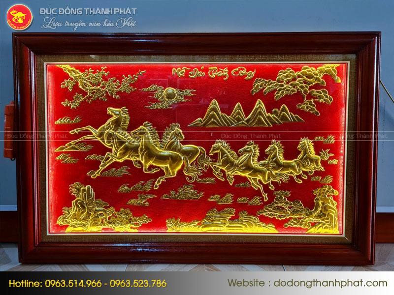 Tranh mã đáo thành công bằng đồng của đồ đồng Thành Phát cung cấp với hình ảnh 8 chú ngựa dũng mãnh cùng phi nhanh về 1 hướng, cũng đi tới mục tiêu chung, nhanh hoàn thành mục đích ở vị trí trên đồng cỏ hoặc biển nước mênh mông, theo phong thủy, số 8 có ý nghĩa là may mắn và phát đạt. Tuy nhiên, trong tranh ta lại thấy có một con ngựa quay đầu trở lại nhìn các con còn lại, với mục đích cỗ vũ, khích lệ, động viên cũng nhau cố gắng trên chặng đường đầy gian nan, thử thách.