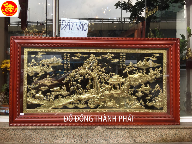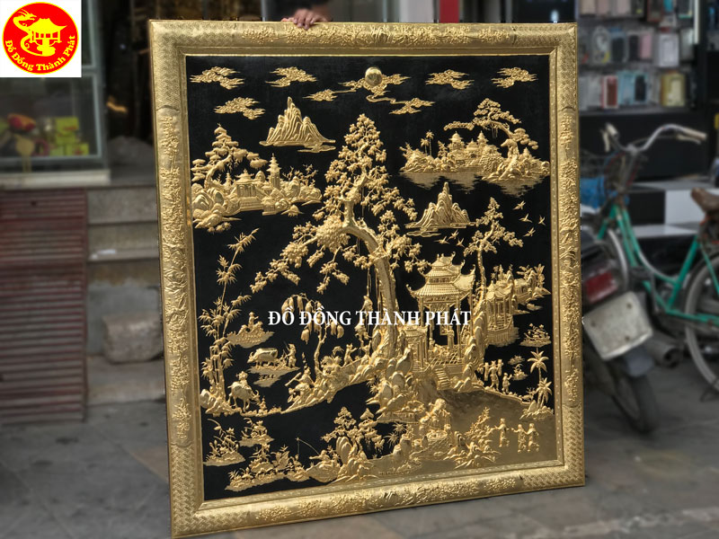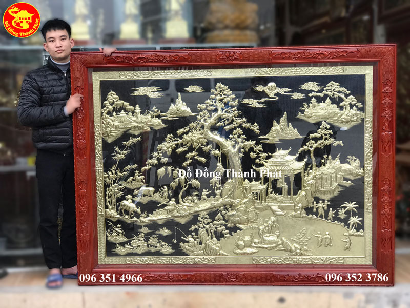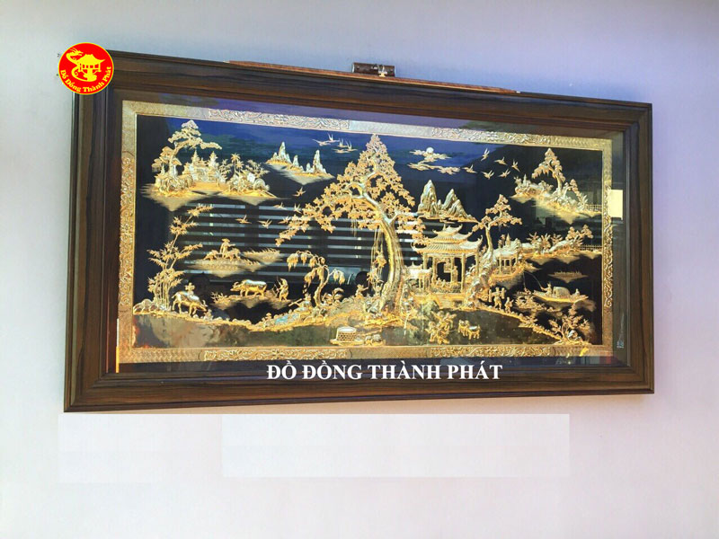( Bức tranh đồng quê bằng đồng khung gỗ gụ đục tứ quý cao 1,55 m ngang 1,76 m, sơn nền đen đồng dầy 8 dem )